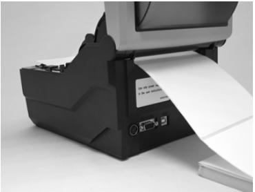 | 2. Faites passer l'Étiquette à pliage paravent par la fenêtre ouverte à l'arrière de l'Unité. Remarque: Assurez-vous que la face imprimée du support est orientée vers le haut. |