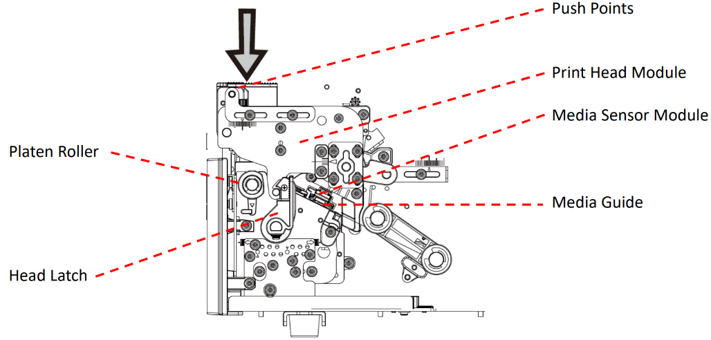 4. L'etichetta deve essere rivolta verso l'alto quando il supporto passa attraverso il modulo della testina di stampa. Infilare il supporto