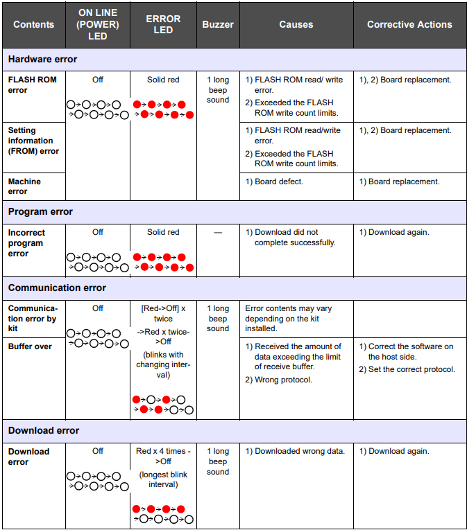 De lampjes ON LINE (POWER) en ERROR (FOUT) branden of knipperen in de onderstaande kleuren en patronen om