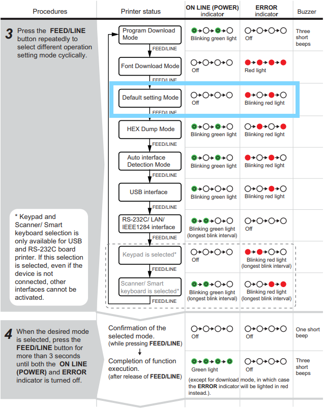 Wanneer de modus voor standaardinstelling wordt geselecteerd en uitgevoerd, wordt de printer ingesteld op de standaardinstelling.