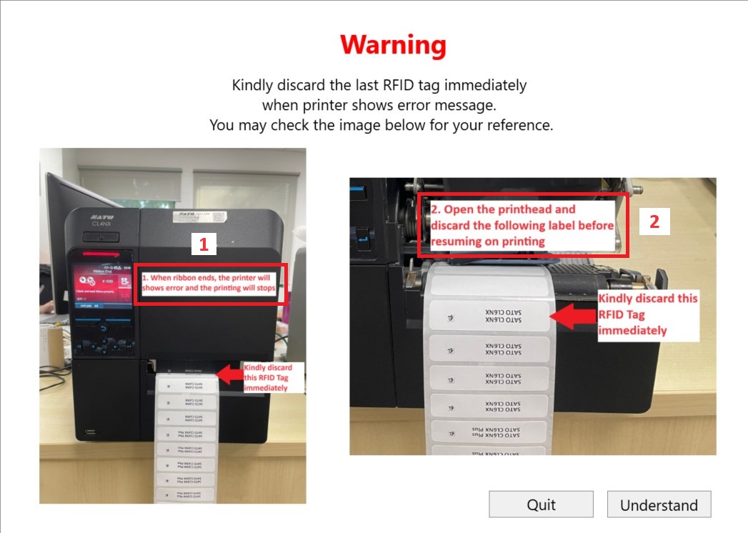 8. Vervolgens verschijnt er een dialoogvenster Waarschuwing om de gebruiker te waarschuwen dat hij labels moet weggooien als er een