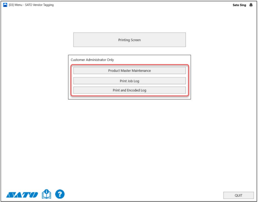 1. Klik op het [SATO] logo links onderaan om het [Menu] te openen. Als u ingelogd bent met een account met beheerderstoegang, zijn er extra functies beschikbaar in het hoofdmenu.
