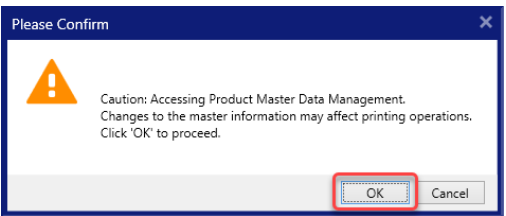 Wanneer u de optie [Product Master Maintenance] selecteert, verschijnt er een bericht om de gebruiker
