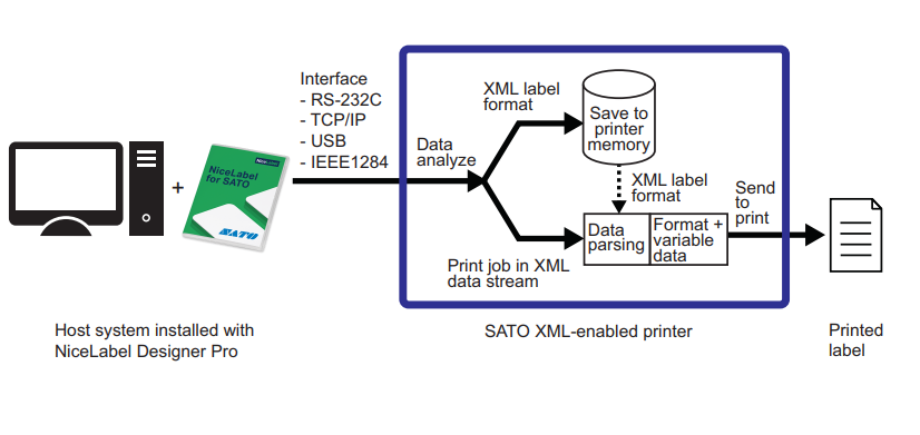 3. 3. De host stuurt een afdruktaak in XML formaat naar de SATO XML-geschikte printer via een netwerk met behulp van een interface zoals TCP/IP of via een andere verbindingsmethode. De gegevens die van het hostsysteem naar de SATO XML-printer worden gestuurd, worden door de firmware van de printer geanalyseerd om te zien of het een SBPL- of XML-gegevensstroom is.
